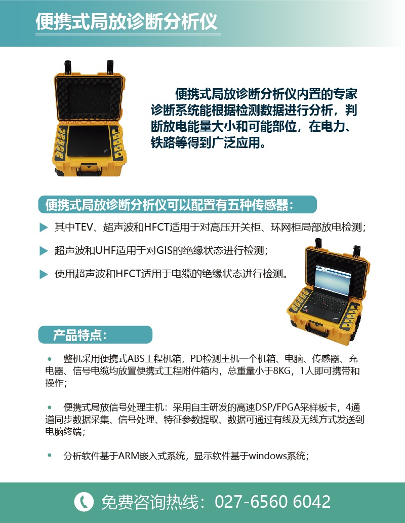 整機采用便攜式ABS工程機箱,PD檢測主機一個機箱、電腦、傳感器、充電器、信號電纜均放置便攜式工程附件箱內(nèi),總重量小于8KG,1人即可攜帶和操作