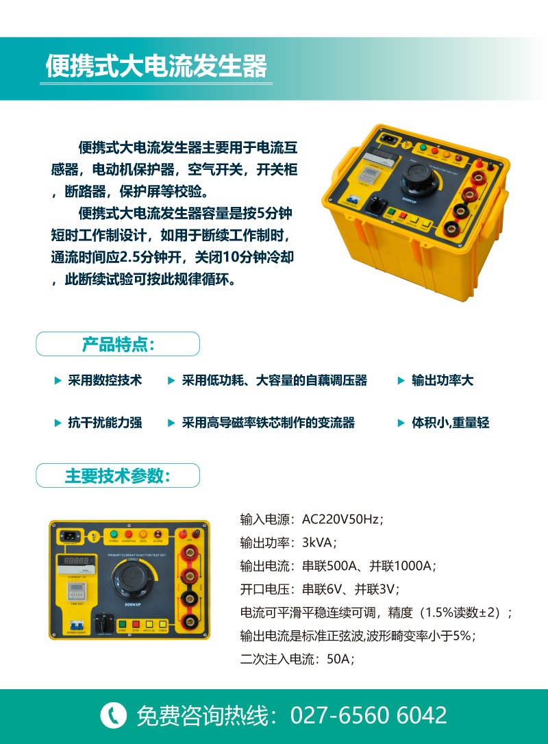 CYSL-BX-200便攜式大電流發(fā)生器是通過多年實踐經(jīng)驗自行研制開發(fā)的測試設備,它集國內(nèi)外同類產(chǎn)品的優(yōu)點于一身,采用數(shù)控技術,抗干擾能力強,和上一代升流器相比,由于采用低功耗、大容量的自藕調(diào)壓器和高導磁率鐵芯制作的變流器,具有輸出功率大,體積小,重量輕等優(yōu)點。主要用于電流互感器,電動機保護器,空氣開關,開關柜,斷路器,保護屏等校驗。