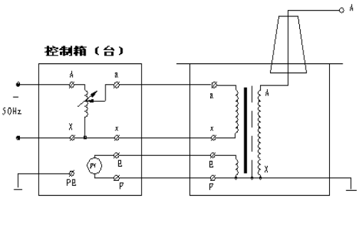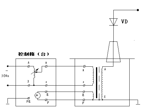 圖3:交流干式試驗變壓器接線 2. 交直流干式試驗變壓器:如圖4 圖中高壓輸出的上端裝有高壓硅堆,串接在高壓回路中作半波整流,以獲得直流高電壓。當(dāng)取下不接高壓硅堆時,作為直流輸出狀態(tài)。