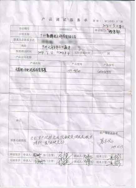 2014-06-03 廣州藍鱒電子科技有限公司進行調(diào)試服務(wù),調(diào)試產(chǎn)品:CYYT-5/10無局部放電試驗成套裝置