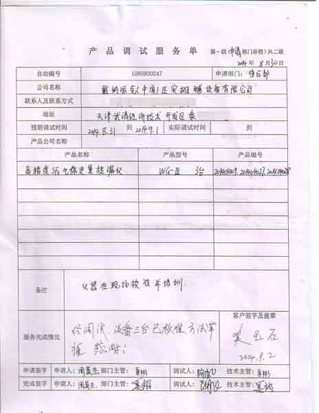 2014-08-31  戴納派克(中國)壓實攤鋪設備有限公司進行調(diào)試服務,調(diào)試產(chǎn)品:CYWG-III高精度SF6氣體定量檢漏儀