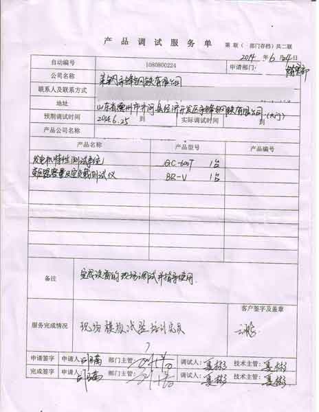 2014-10-30  山東萊鋼永鋒鋼鐵有限公司 進(jìn)行調(diào)試服務(wù),調(diào)試產(chǎn)品:CYBR-V變壓器容量及空負(fù)載測試儀   CYGC-600T發(fā)電機(jī)特性測試系統(tǒng)