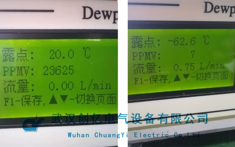 CYWS-242 SF6微水測(cè)量?jī)x進(jìn)行檢測(cè)時(shí),先用高純氮清洗測(cè)量管道,通過(guò)調(diào)節(jié)測(cè)量管道上的針型閥,流量調(diào)節(jié)到0.75L/min,測(cè)出數(shù)據(jù):7ppmv;后續(xù)還對(duì)SF6新氣微水值也做了同樣測(cè)量,得出結(jié)果為11ppmv。兩項(xiàng)試驗(yàn)均符合標(biāo)準(zhǔn)。